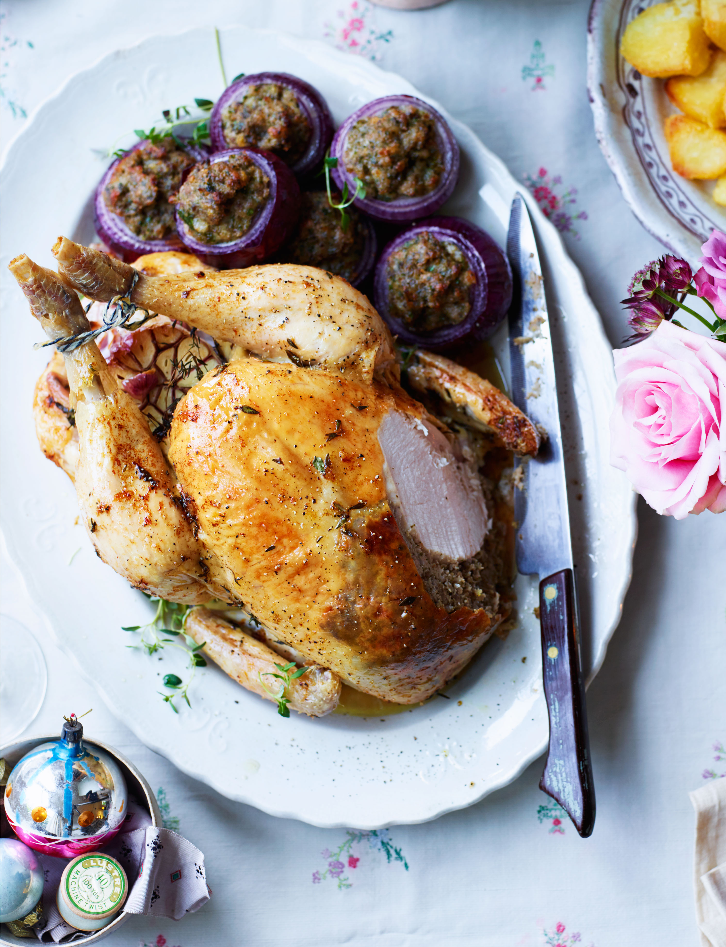 Lemon Thyme And Garlic Roasted Chicken With Chestnut Stuffing Filled Red Onions